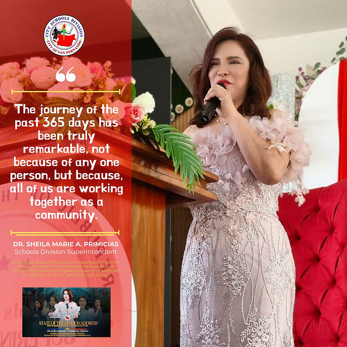 The Schools Division Office of the City of San Fernando, La Union invites our teachers, school leaders, partners, and community advocates to a gathering that reflects one full year of shared work and shared hope—the State of the Division Address of our Schools Division Superintendent, Dr. Sheila Marie A. Primicias, CESO VI. The 2025 SODA is not merely a report. It is a look back at 365 days of steady leadership, where programs were strengthened, partnerships grew deeper, and every effort—small or big—was carried with the learner at the center. It is the story of a division that moved together, stood together, and chose to serve together.